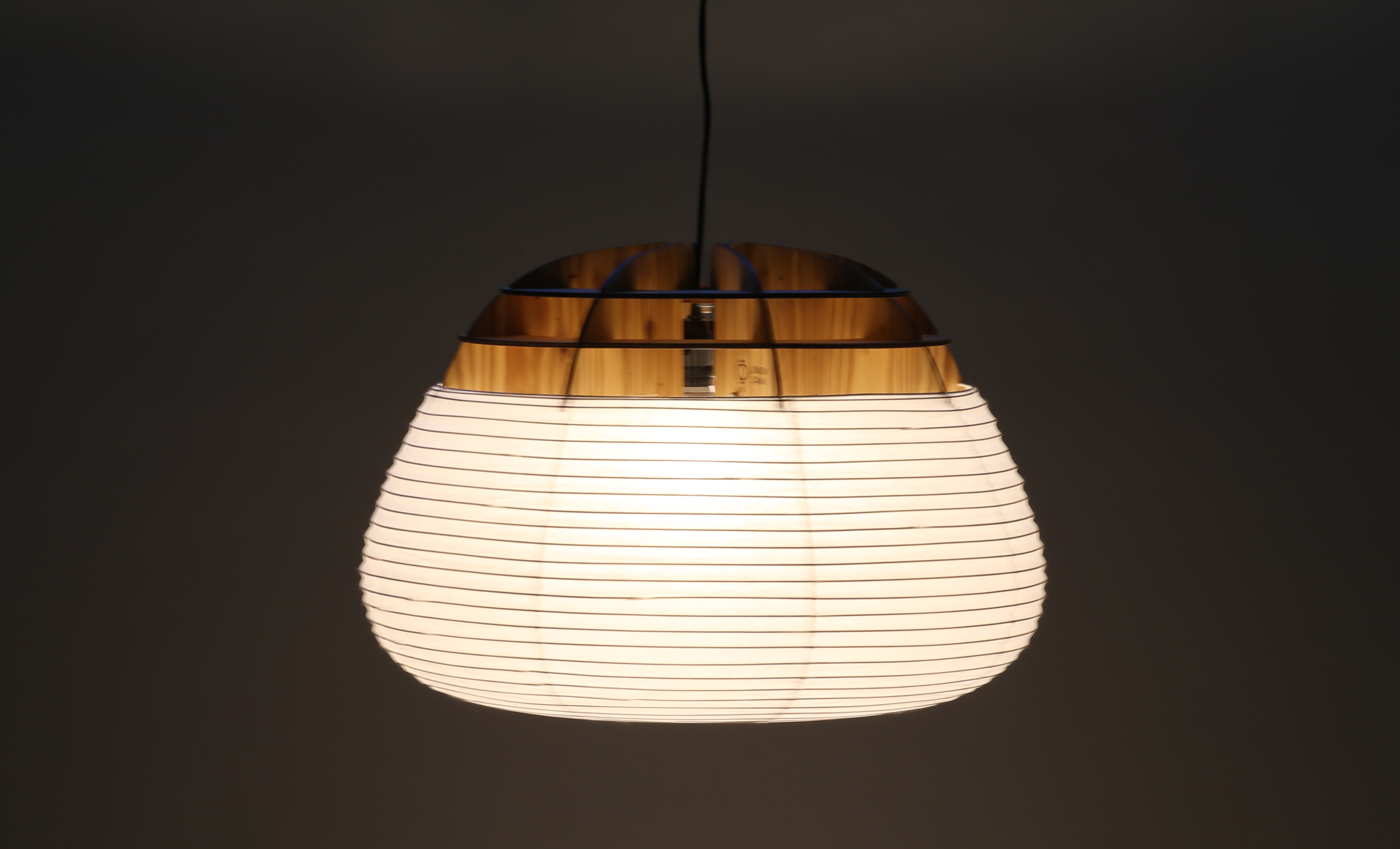 山々が多く緑豊かな岐阜の地域特性と提灯の伝統技術を駆使して生み出された本製品は、飛行機から着想を得たフレームには地元の長良杉を、シェードには楮和紙や竹ひごを用いて作られています。